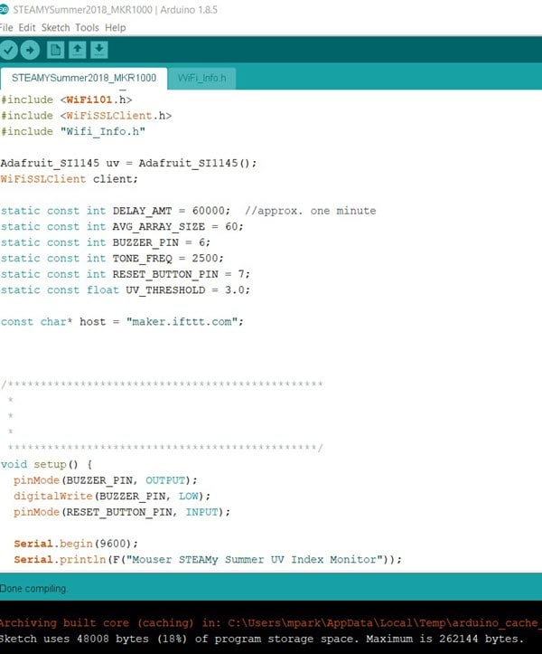 In the WiFI_Info.h file, be sure to replace this default with your personal IFTTT API key that you will generate when you create a webhook for this project. Be sure to keep the quotation marks.