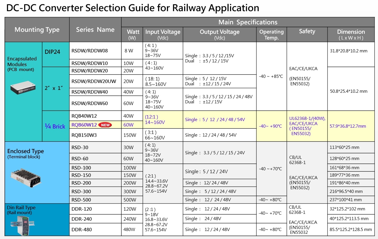 MEAN WELL RQB60W12 Quarter-Brick Railway DC-DC Converters are encapsulated modules with a 12:1 ultra-wide input range of 14VDC to 160VDC, which covers the mainstream nominal voltages of global railway systems. These 60W units offer 5V / 12V / 24V / 48V / 54V single-output voltage, -40°C to +90°C operating temperature range, 2KVAC or 3KVDC input/output isolation, and full protections (overtemperature, overvoltage, overload, input undervoltage, and short-circuit). Additional features include international standard pins, high efficiency of up to 91.5%, EN 50155 compliance, and EN 45545-2 compliance with external circuits. MEAN WELL RQB60W12 Quarter-Brick Railway DC-DC Converters are ideal for bus, tram, metro, and railway systems, as well as telecom/datacom systems, wireless networks, and harsh environments, including vibrating, dusty, and extreme temperatures.Features